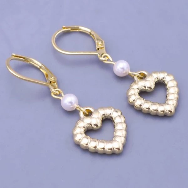 Náušnice z chirurgické oceli, jsou povrchově upraveny zlacením 14kar. v ČR. Odstín českého zlata bez niklu. Srdíčka o velikosti 13mm zdobí perlička Swarovski 4mm v bílé barvě. Pohodlné zapínání na klapku. Celková délka náušnice se zapínáním je 35mm 22352
