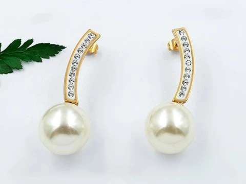 Náušnice z chirurgické oceli visací zlaté zdobené bílou perlou a krystal kamínky. ROZMĚR 4,1 x 1,6 cm