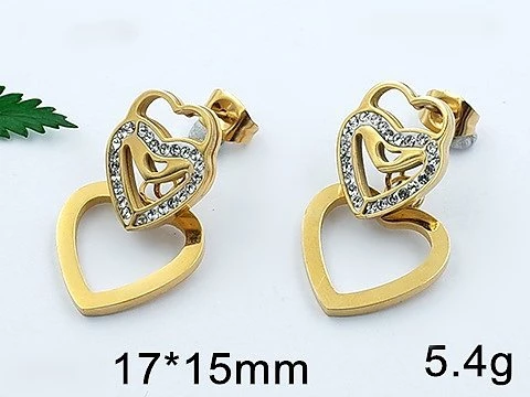 Náušnice z chirurgické oceli ve zlaceném provedení oceli. Náušnice trojité srdce, visací. Náušnice zdobené štrasovými krystal kamínky. ROZMĚR 1,7 x 1,5 cm HMOTNOST 5.4g