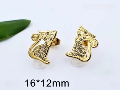 Krásné náušnice z chirurgické oceli. Náušnice ve zlatém provedení oceli ve tvaru kočky, zdobené crystal kamínky. Rozměry 16x12mm