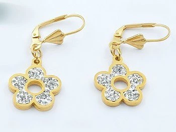 Náušnice z chirurgické oceli. Náušnice s přívěskem květiny, zdobené štrasovými kamínky. Chirurgická ocel ve zlatém provedení. ZAPÍNÁNÍ NÁUŠNICE Klapka BARVA KAMENE Crystal DÉLKA NÁUŠNICE 2 cm typ náušnice visací 20773