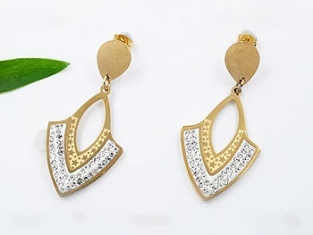 Náušnice Chirurgická Ocel zlatá. Náušnice zdobené skleněnými kamínky v bílém odstínu Krystal a rovněž i s ozdobným gravírem. Délka 5 cm, šířka 1.5 cm. Zapínání puzeta.