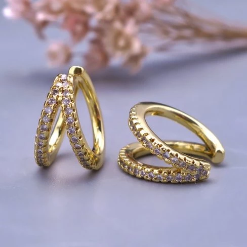 Pozlacená záušnice z chirurgické oceli dvojitý kroužek, je zdobená jemnými čirými zirkony.