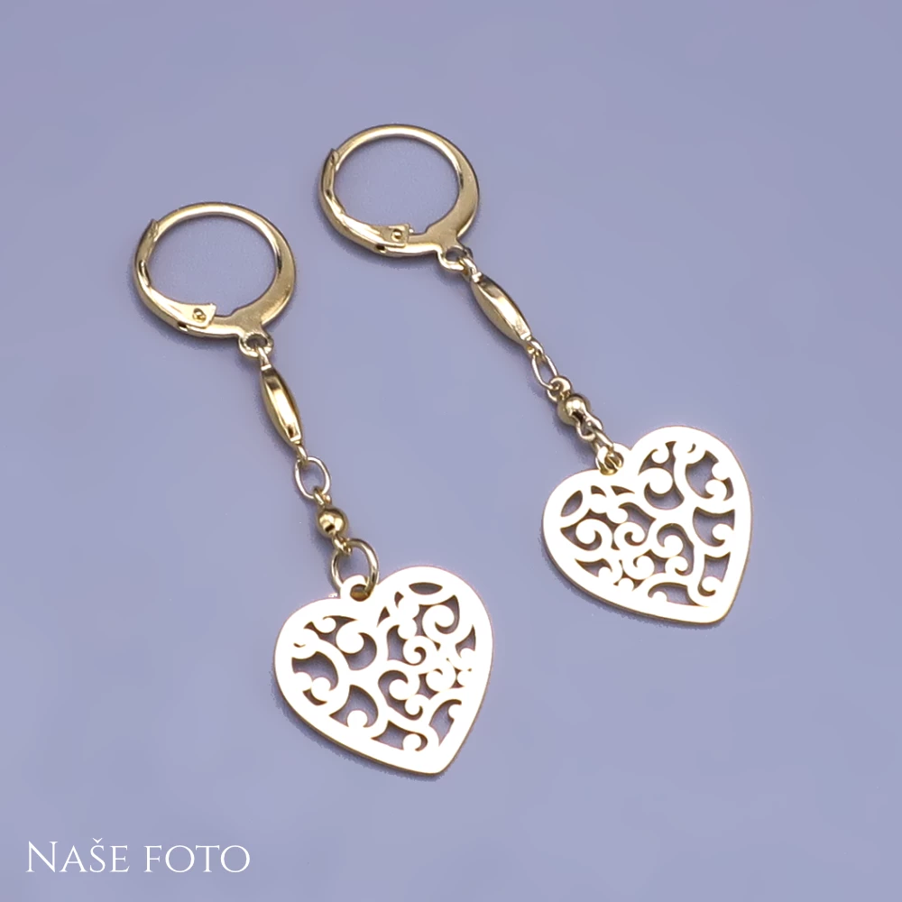 Elegantní visací náušnice z pozlacené chirurgické oceli se srdíčky s jemným ornamentálním výřezem. Srdíčko je zavěšeno na decentním řetízku, díky kterému se náušnice krásně pohybují a působí lehce a žensky. Nadčasový motiv lásky v čistém, elegantním provedení se hodí ke každodennímu nošení i ke slavnostnějším příležitostem.