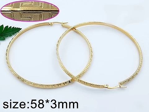 Náušnice z chirurgické oceli, velké kruhy ve zlatém provedení chirurgické oceli. Zdobené ornamenty. Průměr kruhu 5,8 cm.