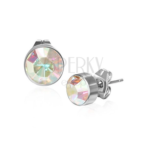 Náušnice z nerezavějící oceli se vsazeným zirkonem duhové barvy. Puzetové zapínání.