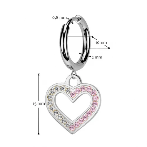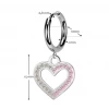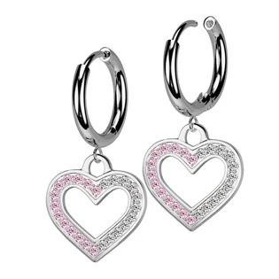 Ocelové kruhové náušnice se zavěšenými srdíčky dekorovanými růžovými a čirými zirkonky