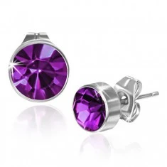 Puzetové náušnice z oceli 316L ve stříbrném odstínu mají tvar kruhu, který vyplňuje tmavě fialový broušený zirkon zasazený v kulaté lesklé objímce.