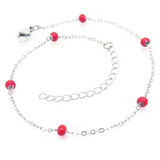 Dámský ocelový náramek na nohu dekorovaný korálky červené barvy