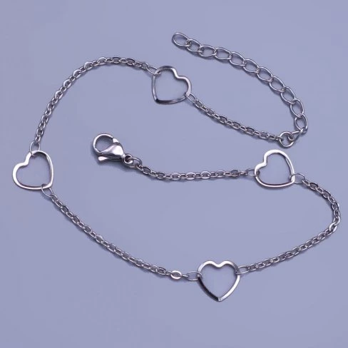 Řetízek na nohu z leštěné chiriurgické oceli je zdobený srdíčky o velikosti 10mm.