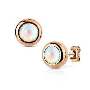 Zlacené ocelové náušnice zdobené syntetickými opály bílé barvy Ocelové náušnice jsou vyrobeny z chirurgické oceli s jakostním označením 316L Parametry materiál chirurgická ocel povrchová úprava růžové zlato druh kamene opál typ uzávěru puzeta rozměr kamene 6 mm rozměr náušnic 9 mm