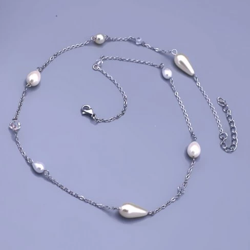 Řetízek z chirurgické oceli o šířce 1,2mm je doplněn o syntetické bílé perleťové perličky a krystalky Swarovski.