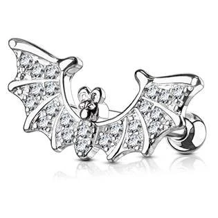 Cartilage piercing do ucha ve tvaru netopýra zdobeného kamínky Piercing je vyroben z chirurgické oceli 316L a kvalitní bižuterie Parametry materiál chirurgická ocel povrchová úprava rhodium rozměr tyčky 1,2 x 6 mm barva ocelová rozměr ozdobné části 15 x 8 mm průměr kuličky 3 mm