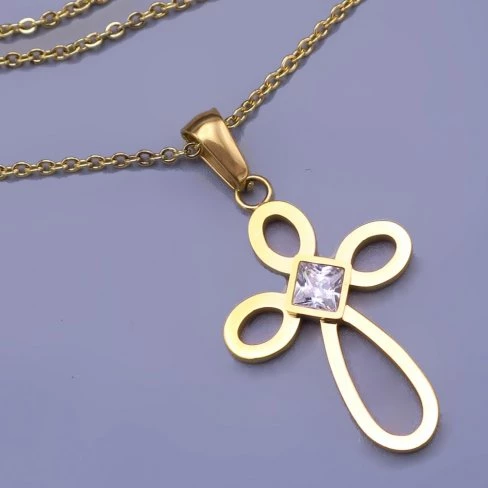 Pozlacený křížek z leštěné chirurgické oceli, zdobí 4mm čirý zirkon ve tvaru čtverce.