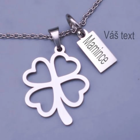 Přívěsek z chirurgické oceli čtyřlístek s destičkou z chirurgické oceli.