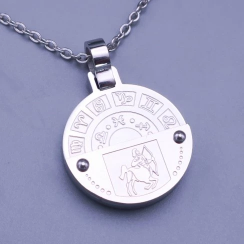 Krásný kruhový přívěsek z chirurgické oceli se znamením - STŘELEC. Přívěsek je z přední strany zdobený jemnými rytinami a symbolem znamení STŘELEC. Součástí přívěsku je řetízek z chirurgické oceli o šířce 2mm a volitelné délce od 40cm do 70cm.