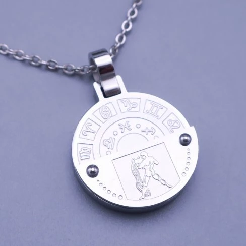Krásný kruhový přívěsek z chirurgické oceli se znamením - VODNÁŘ. Přívěsek je z přední strany zdobený jemnými rytinami a symbolem znamení VODNÁŘ. Součástí přívěsku je řetízek z chirurgické oceli o šířce 2mm a volitelné délce od 40cm do 70cm.