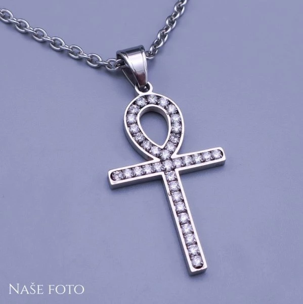 Krásný dámský přívěsek z chirugické oceli - nilský kříž (Anch). Kříž je zdobený zářivými čirými kamínky, které mu dodávájí luxusní vzhled. Nilský kříž je zvláštní typ kříže, který je spojován s významnými egyptskými Bohy. Říká se, že nilský kříž má dvě strany, znichž každá funguje jiným způsobem. Jedna strana kříže nasává negativní energii a sílu, která je pak křížem proměněna na pozitvní sílu a je je druhou stranou šířena ven. Chirurgická ocel je vhodná pro osoby s alergiemi na běžné kovy. Rozměry kříže: 4cm x 2,5cm Šířka řetízku: 2mm Délka řetízku: volitelná od 40cm do 60cm 8112