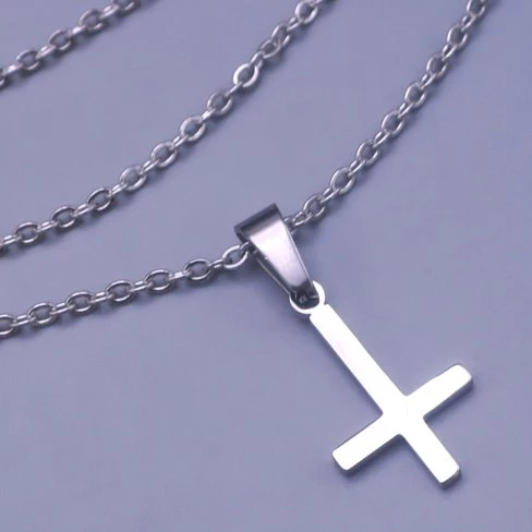 Přívěsek z leštěné chirurgické oceli obrácený křížek.