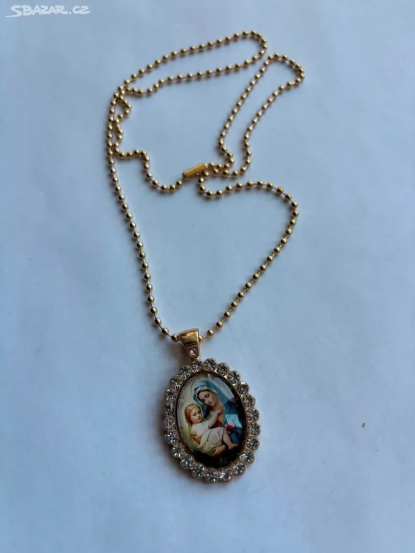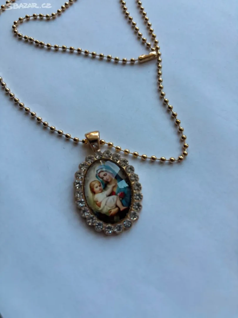 Elegantni oválný náboženský medailonek s průhledným rámečkem ,který je zdobený Pannou Marií s Ježíškem