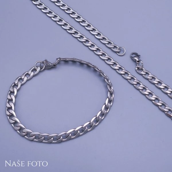 Moderní ocelová souprava pro muže, skládající se z řetízku a náramku ve stejném provedení typu Pancer. Náramek i řetízek jsou zdobeny jemným rytím (rýhováním) a na těle vypadají velice moderně a stylově. Ocelové šperky jsou perfektní variantou pro každodenní nošení, jelikož materiál chirurgická ocel je pevná, nelámavá, odolná proti poškrábání, nemusí se sundávat při namáčení a zárověn se jedná o antialergenní materiál, vhodný pro osoby s alergiemi na šperky vyrobené z běžných kovů. Délka řetízku: volitelná od 5055-60 cm Délka náramku: volitelná od 19-20-21 cm Šířka řetízku-náramku: 6 mm 7747