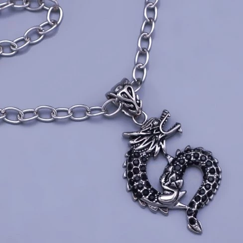 Přívěsek z chirurgické oceli čínský drak, je zdobený černými zirkomy.
