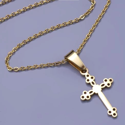 Jemný jetelový pozlacený křížek z chirurgické oceli.