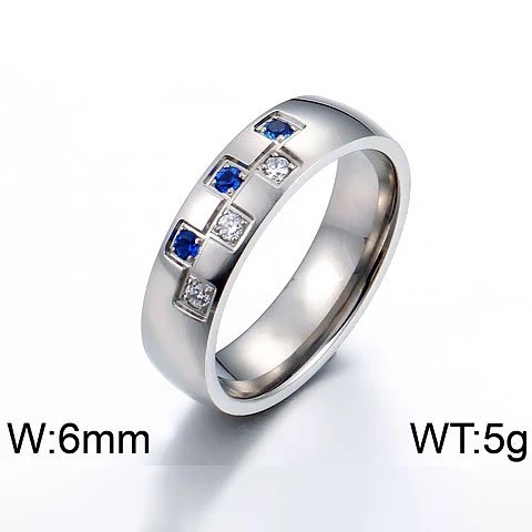 Prstýnek z leštěné chirurgické oceli je zdobený jemnými zirkony čiré a modré barvy. Šířka prstenu 6mm Skladem vel.58-průměr 19mm