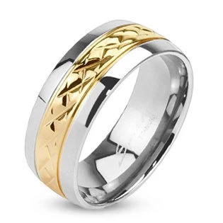 Titanový prsten je zdobený zlacenou povrchovou úpravou v barvě žlutého zlata Titanové šperky mají typickou šedou barvu a jsou velmi lehké. Titan je kov hypoalergenní kov, který nezpůsobuje žádné negativní reakce organismu, titanové šperky jsou tedy vhodné pro osoby se zvýšenou citlivostí na kovy. Parametry materiál titan povrchová úprava lesklá, žluté zlato velikost prstenu 57 šíře prstenu 6 mm typ prstenu dámský, pánský