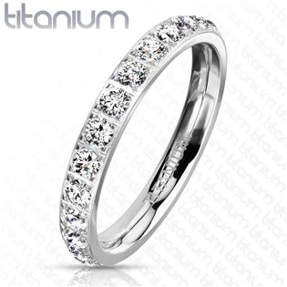 Dámský prsten z titanu dekorovaný kubickými zirkony čiré barvy Titan patří k nejtvrdším kovům používaným na výrobu šperků. Na stupnici tvrdosti má titan hodnotu 6. Vyznačuje se mimořádnou chemickou stálostí - je zcela netečný k působení vody, slunečnímu svitu a odolává působení většiny běžných minerálních kyselin i roztoků alkalických hydroxidů. Titanové šperky mají typickou šedou barvu a jsou velmi lehké. Titan je kov hypoalergenní kov, který nezpůsobuje žádné negativní reakce organismu, titanové šperky jsou tedy vhodné pro osoby se zvýšenou citlivostí na kovy. Titan je 100% hypoalergení a nezpůsobuje podráždění pokožky. Parametry materiál titan povrchová úprava lesklá šíře prstenu 3 mm druh kamene zirkon typ prstenu dámský Vyberte variantu 51 52 54 55 56 57