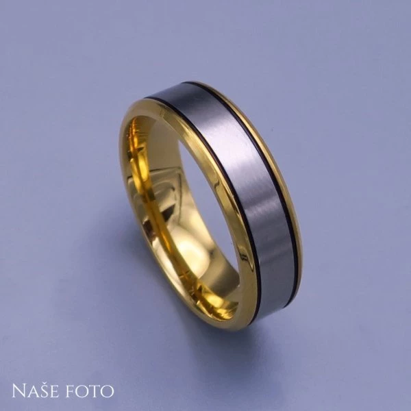 Moderní prstýnek z chirurgické oceli a pozlacené chirurgické oceli, vhodný pro ženy i muže. Prstýnek je zhotoven v kombinaci stříbré a zlaté barvy a po okrajovém obvodu je na obou stranách zdoben černým proužkem. Prstýnky a obecně šperky z chirurgické oceli jsou vhodné pro osoby alergické na běžné kovy. Výběr velikostí: dámské velikosti (šířka prstenu 4mm): velikosti , 49, 52 7783