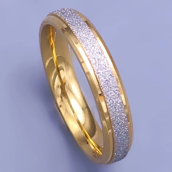Prstýnek z leštěné chirurgické oceli je zdobený pískováním v kombinaci zlacení. Šířka prstýnku 4mm Velikost 54 vnitřní průměr 17mm P134