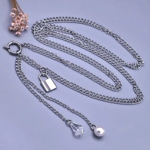 Řetízek je zdoben bílou perlou Swarovski o velikosti 12mm, čirým krystalem Swarosvki slza 21x12mm a přívěskem zámek z chirurgické oceli 23x13mm.