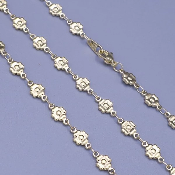 Řetízek z chirurgické oceli složený z oboustraných kytiček je povrchově upravený zlacením 14Kar.Síla zlacení 3mikrony. Zlacení je opatřeno lakem ,který jej chrání a prodlužuje krásný lesklý vzhled. Zlaceno v ČR v odstínu českého zlata. Velikost kytiček 5mm Délka : Na výběr z variant 45cm, 50 cm . K řetízku nabízíme také náramek a náramek na kotník. RZ066