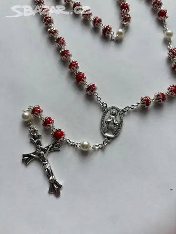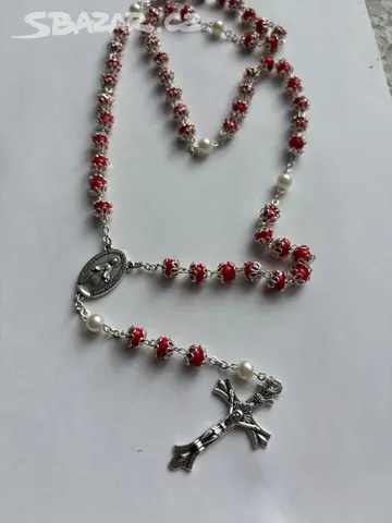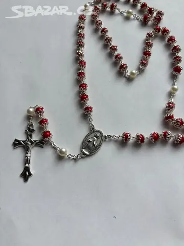 Nádherný růženec v červené barvé zdobené bílými košíčkami a bílými perličkami Celková délka i s křížem 90cm Velikost kříže 4cm