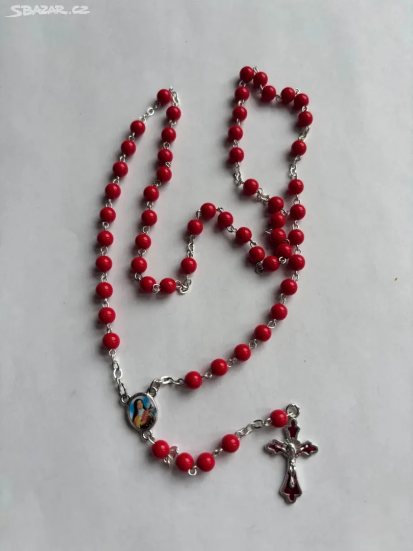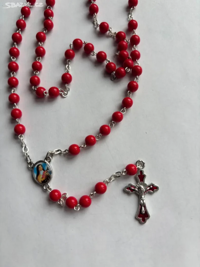 Růženec z červených perliček zdobený barevným křížkem v červené barvě a Madonkou zobrazenou z přední i zadní straně