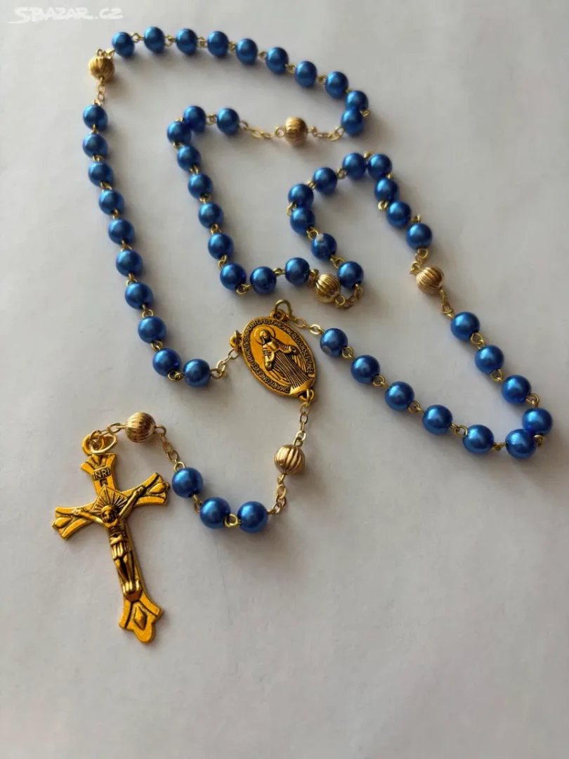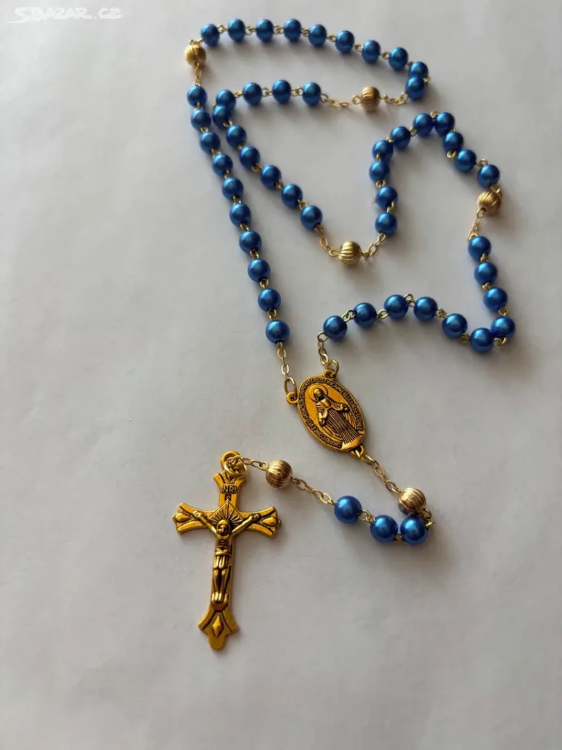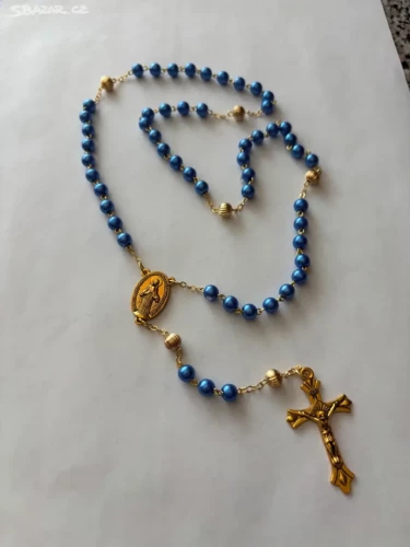 Zlacený růženec zdobený modrými perličkami broušenými zlacenými korálky,zlacenou Madonkou a křížem