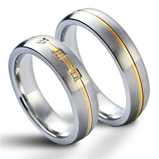 Ocelové snubní prsteny zdobené zlaceným pruhem. Dámský prsten je osazen 3mi zirkony čiré barvy