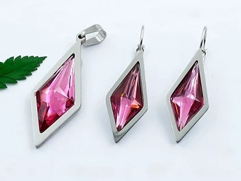 Romantický set z chirurgické oceli. Náušnice a přívěsek. Skleněné kameny v fialové barvě .Délka Náušnic 3,8 cm, šířka 1,2 cm. Přívěsek délka 4,5 cm, šířka 1,5 cm.