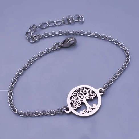 Jemný náramek z leštěné chirurgické oceli je doplněn o symbol stromu života.