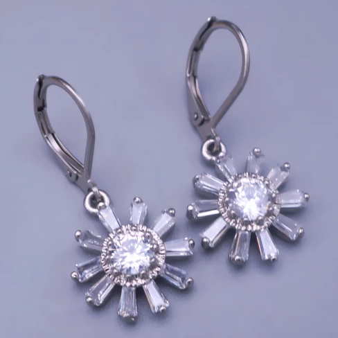 Elegantní visací náušnice z chirurgické oceli, zdobené centrálním kulatým zirkonem, kolem kterého září podlouhlé bagetové kameny ve tvaru kytičky. Díky třpytu a jemnému designu jsou skvělou volbou pro slavnostní i každodenní nošení. Zapínání na klapku pro pohodlí a bezpečnost.