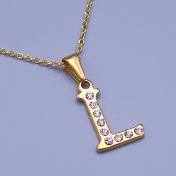Písmeno L z chirurgické oceli je zdobeno čirými zirkony.