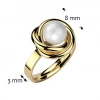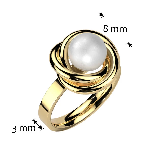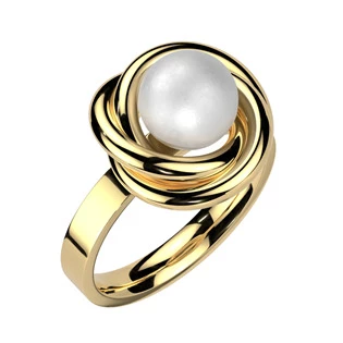 Zlacený celový prsten umělou perlou bílé barvy. Prsten má lesklý povrch v barvě žlutého zlata