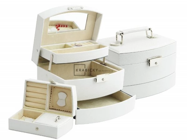 Rozměry: 187x160x165 mm Barva:bílá Použítí: šperkovnice Materiál: koženka Součástí je cestovní šperkovnička
