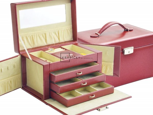 Červená šperkovnice s bočním prostorem a třemi šuplíky. Šperkovnice ve velkém lesku. Rozměr: 267x190x185 mm