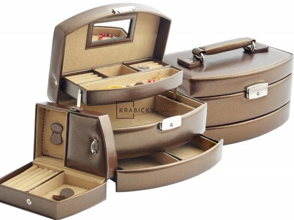 Lesklá šperkovnice v hnědá barvě s malou cestovní šperkovnicí. Rozměr: 225x165x160 mm