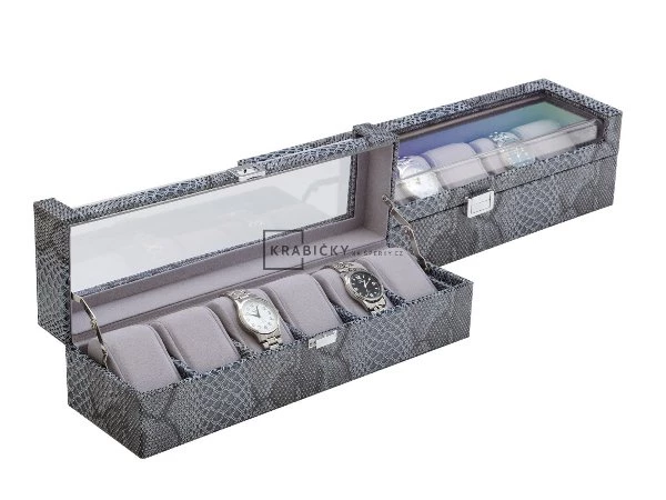 Rozměry: 365x100x115 mm Barva: modrá Použítí: šperkovnice na hodinky Materiál: koženka