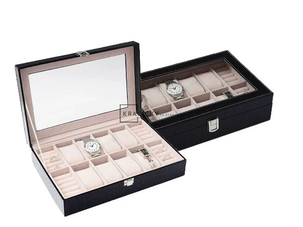 Rozměry: 300x195x75 mm Barva: černá Použítí: šperkovnice na hodinky Materiál: koženka