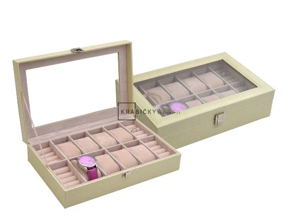 Rozměry: 300x195x75 mm Barva: krémová Použítí: šperkovnice na hodinky Materiál: koženka