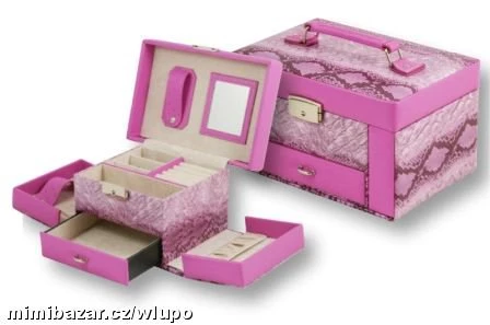 Šperkovnice na vaše šperky Velikost 230mmx135mm Víko opatřené zrcátkem Boční šuplíčky se při otevření šperkovnice rozevřou Jeden šuplíček na otevírání Barva růžová s kombinací žíháním Dvouletá záruka